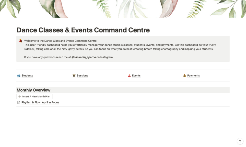 The Dance Classes & Events Command Centre, built on the Notion platform, offers an all-in-one solution to manage your dance studio easily. With interconnected databases for students, sessions, events, and payments, you'll never lose track of essential information again.